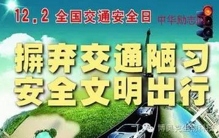 國務院在2012年7月正式批復同意自2012年起,將每年12月2日設立為“全國交通安全日”。今年的交通安全日主題是“摒棄交通陋習,安全文明出行”!