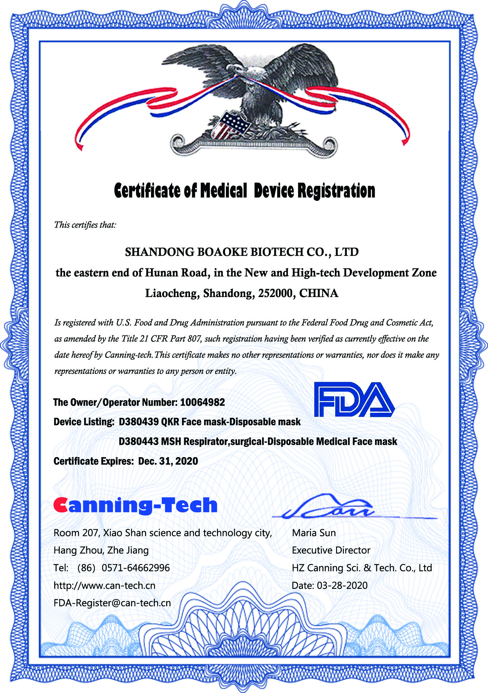 近日新冠病毒在國際肆虐,不少國家的口罩荒成了問題,山東博奧克生物有限公司口罩FDA認證一次性全面通過,根據(jù)聯(lián)邦食品藥品和化妝品備案,在美國食品和藥品管理局注冊,公司已具備出口貿(mào)易資質(zhì)。