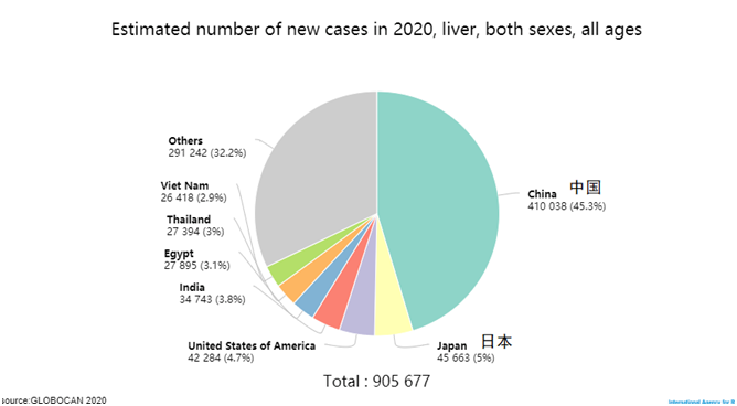 據(jù)世界衛(wèi)生組織國際癌癥研究機構(gòu)(WHO IARC)發(fā)布的2020年最新全球癌癥負擔數(shù)據(jù),2020年,我國肝癌新發(fā)病例數(shù)達41.13萬,占全球45.3%,高居第一。也就是說,全球近一半病例都發(fā)生在中國!而死亡病例數(shù)達39萬例,僅次于肺癌,排在第二位。